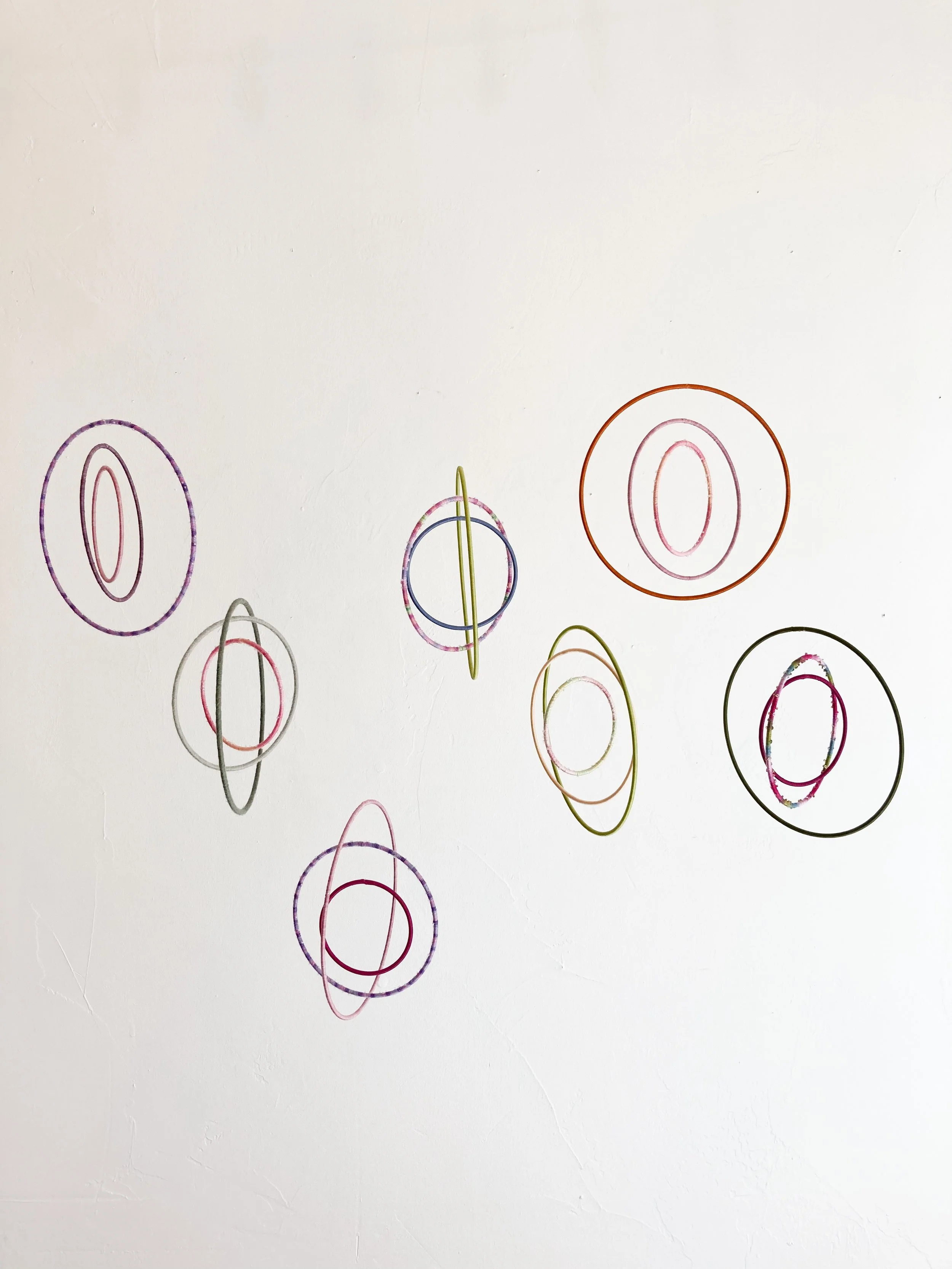 These mobiles are made of threads wrapped around steel hoops. They spin gently in the air currents of the room. The materials and colors are a surprise! Linens, silks, cottons and nylon. Each mobile is 7” x 7”