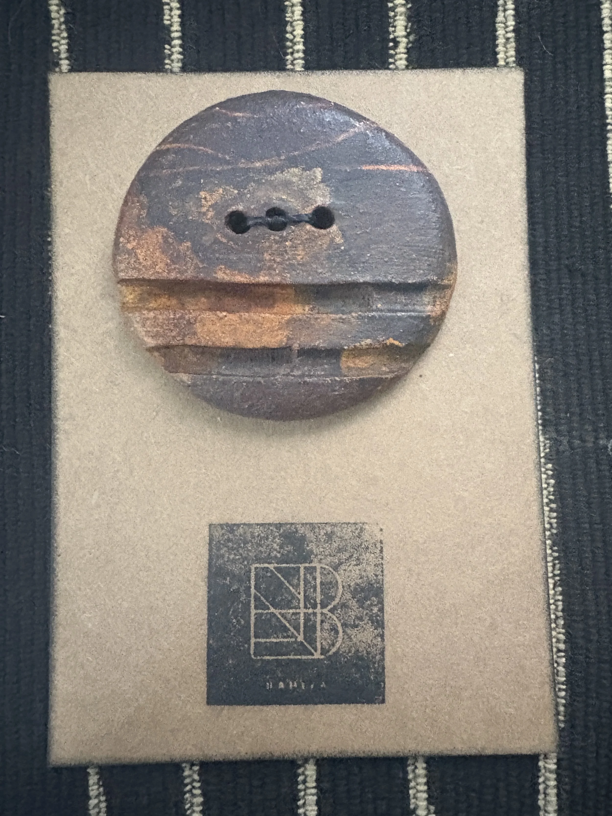 This handcrafted ceramic button is created using a raku foil-sagger firing technique, giving it rich earthy tones and organic surface textures reminiscent of an ancient relic. Measuring approximately 2 inches across, it’s designed as a functional accent for clothing, knitwear, or decorative textile projects. This button brings a touch of handmade artistry and timeless beauty to anything it adorns.